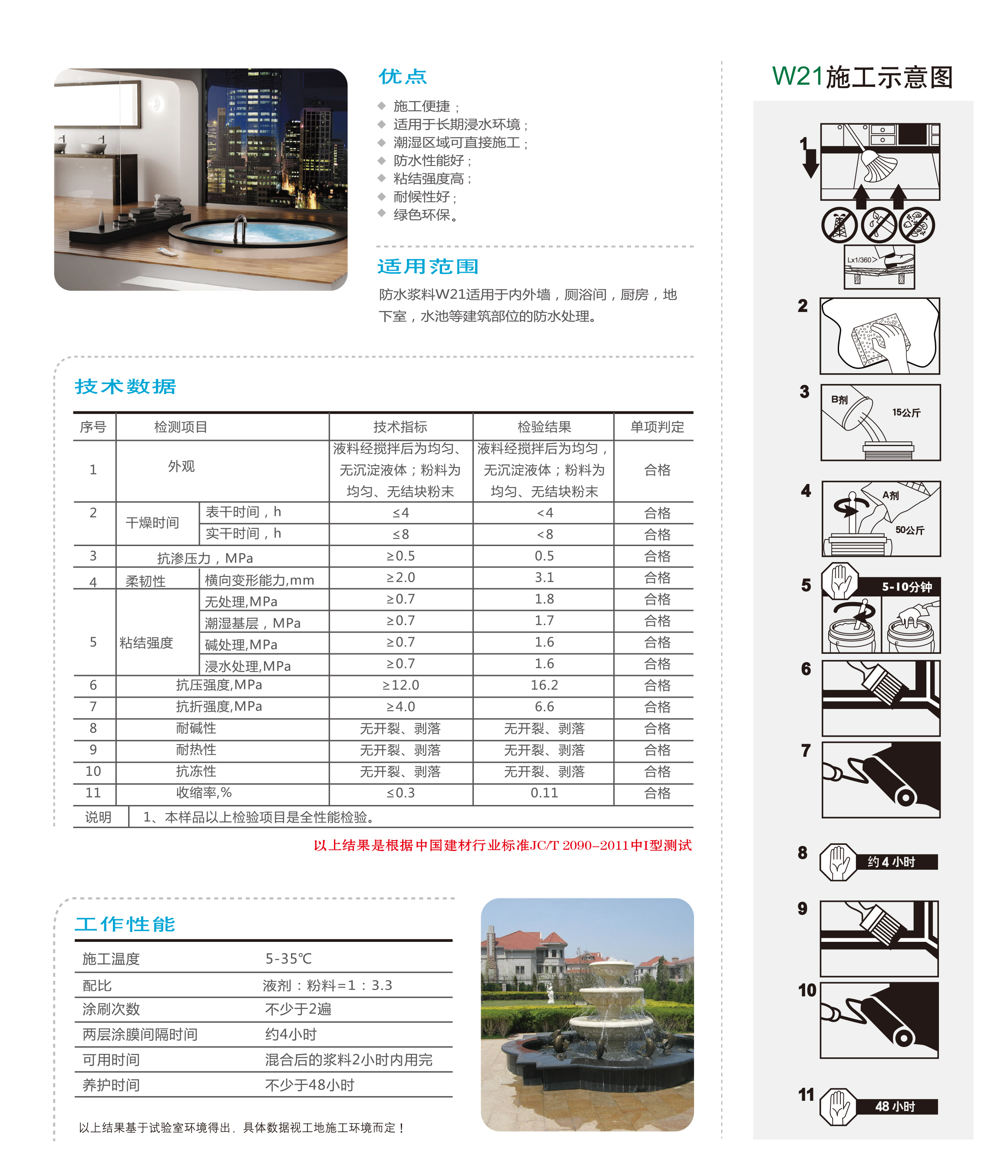 本(ben)産品(pin)按(an)比例(li)適(shi)量(liang)攪(jiao)拌調(diao)咊(he)即可(ke)使(shi)用,具有可(ke)以在潮濕基(ji)麵(mian)施工、抗滲性(xing)強、粘(zhan)結力高(gao)、耐(nai)久性(xing)好的(de)特點。適用(yong)于(yu)內外牆(qiang)、廁浴間、廚(chu)房、地下(xia)室、水(shui)池(chi)等建築部(bu)位(wei)的(de)防水(shui)處(chu)理(li)。